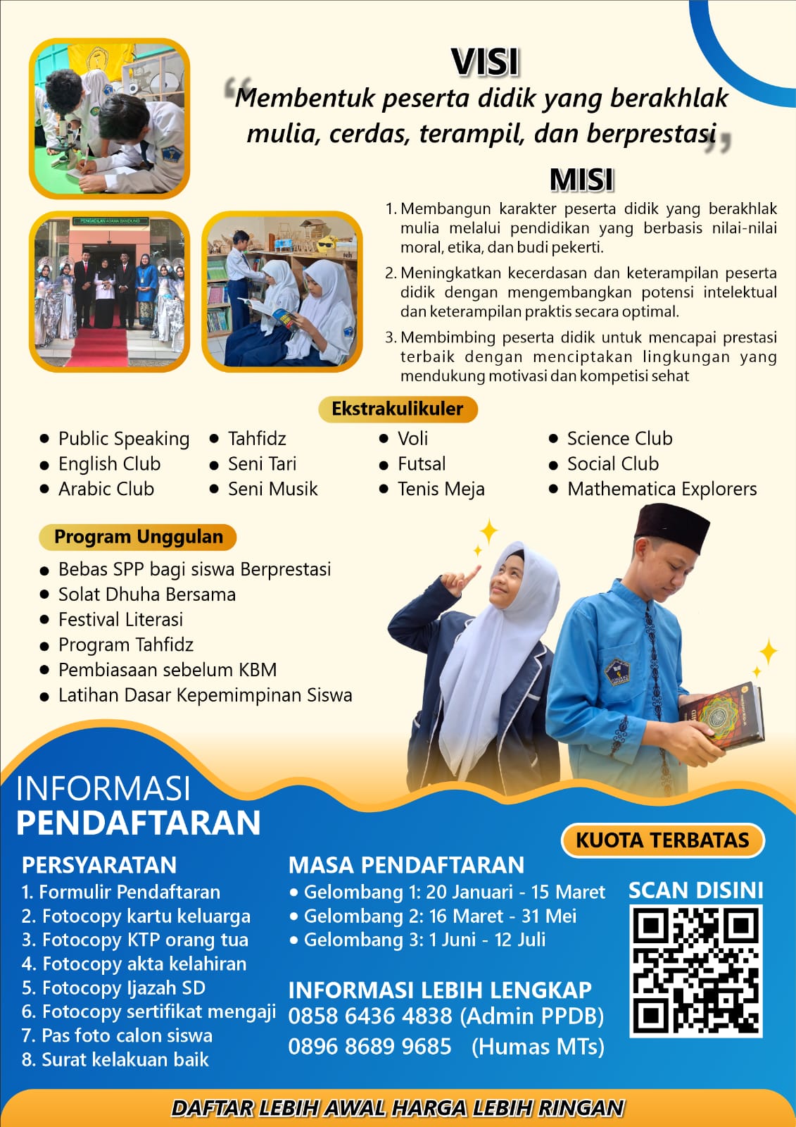 Untuk informasi lebih lanjut, silakan menghubungi panitia PPDB di nomor telepon 089-686-899-685 atau langsung mengunjungi sekolah.